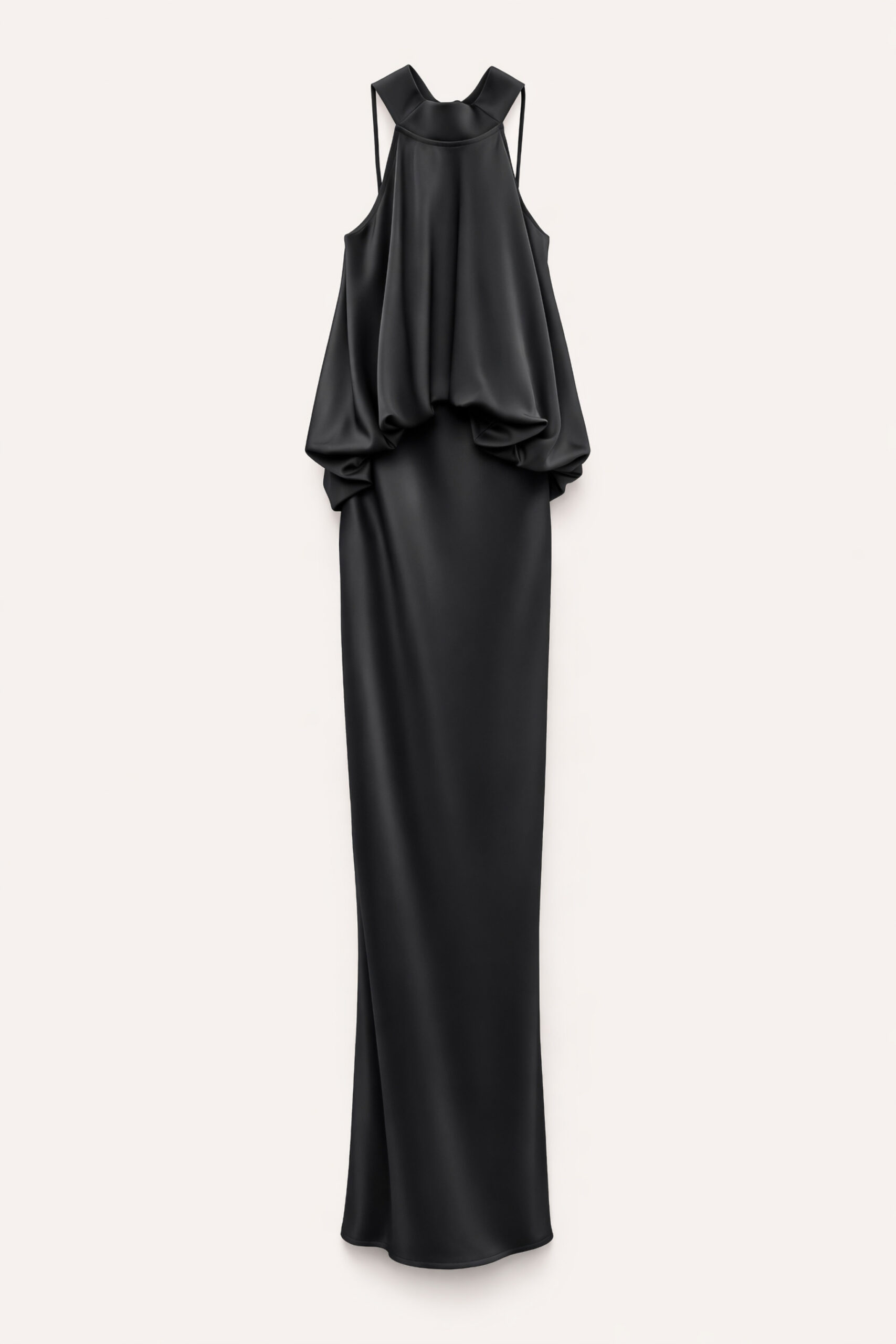 Scollo alto con linea halter con fiocco regolabile sul retro.